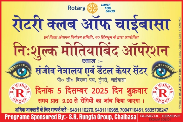 Rc Chaibasa going to organized a CATARACT OPERATION at sanjeev Netralay on 5th December. This program is Sponsored by S. R. Rungta Groups members are requested to attend the program on time