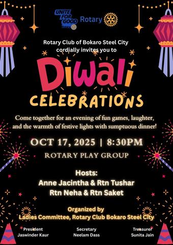 On behalf of the Rotary Club of Bokaro Steel City, I am delighted to extend a heartfelt invitation to you and all esteemed members of your club to join us for our Diwali Celebrations.